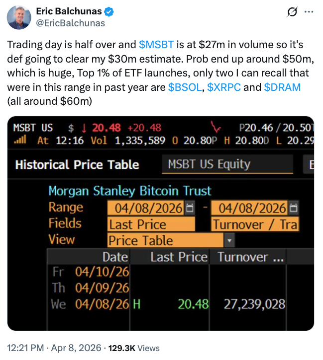 摩根士丹利比特币信托(MSBT),由美国银行推出的首只现货比特币ETF,在交易首日录得30,6百万美元流入。在NYSE Arca于周三开始交易的基金,以34百万美元交易量略微超过了Bloomberg ETF分析师Eric Balchunas的30百万美元预测。截至4月8日,MSBT持有约31,7百万美元价值的444,4枚比特币(BTC),相当于美国现货BTC ETF预计1,29百万枚BTC资产的0,03%。提供最低费率的MSBT,当天位列BlackRock的iShares Bitcoin Trust(IBIT)之后第二位;IBIT录得40百万美元流入。